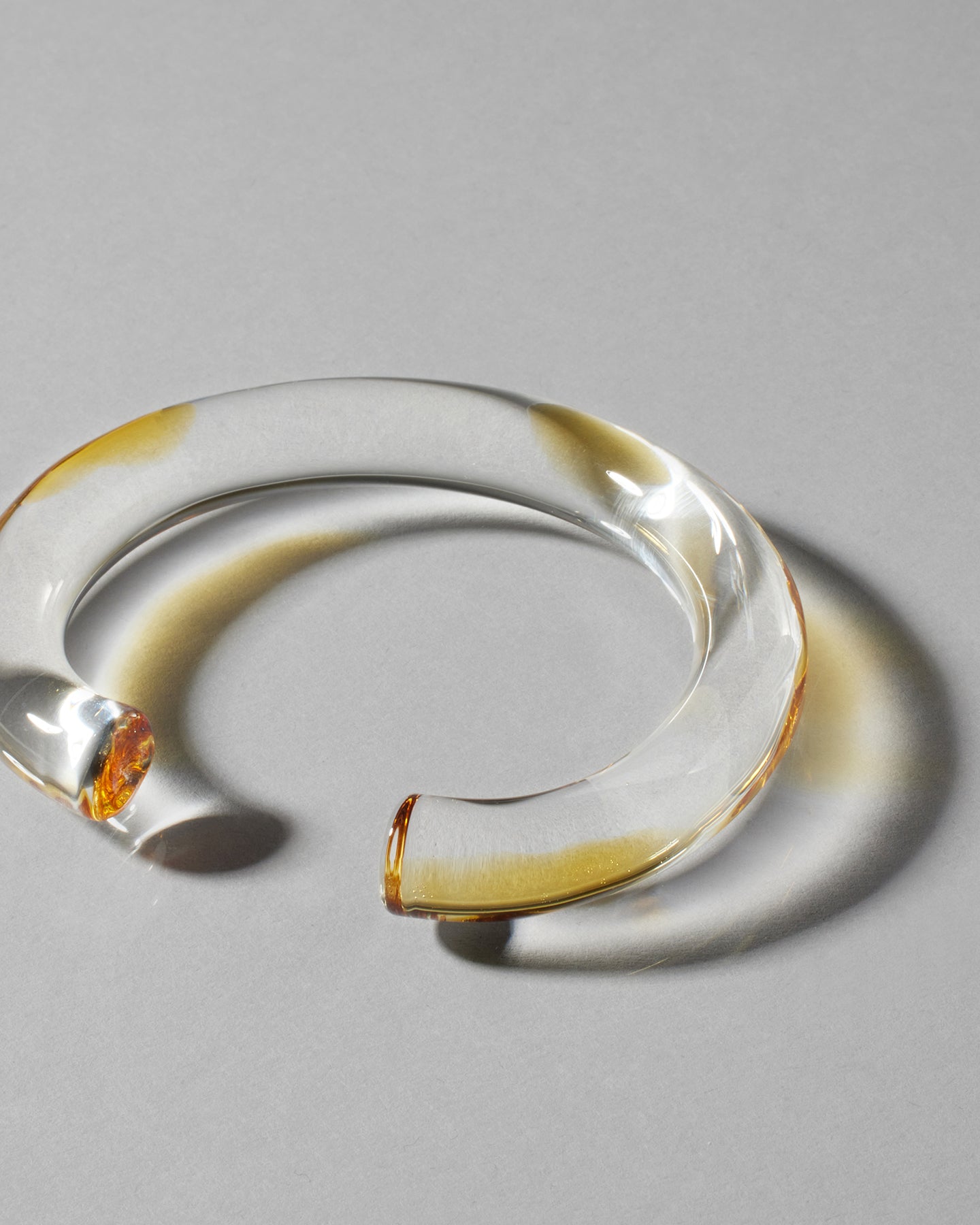透明なガラスに手作業で施されたアンバー色が、まるで光の輪を纏っているかのような印象を与えるイヤーカフ。ボリューム感のあるガラスが繊細さと重厚感を調和させ、さりげなくコーディネートのポイントを演出します。