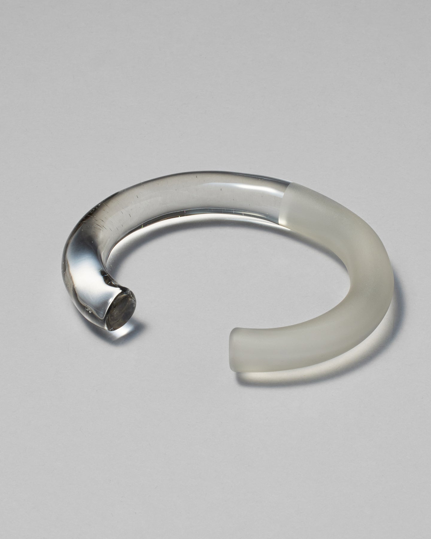手首の形に沿うような楕円型のバングルは、スモーキーグレーの色味がクールでスタイリッシュな印象。マットな質感が柔らかさを引き立て、艶やかなガラスの輝きが手元のアクセントに。